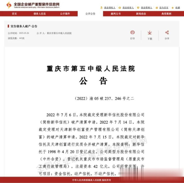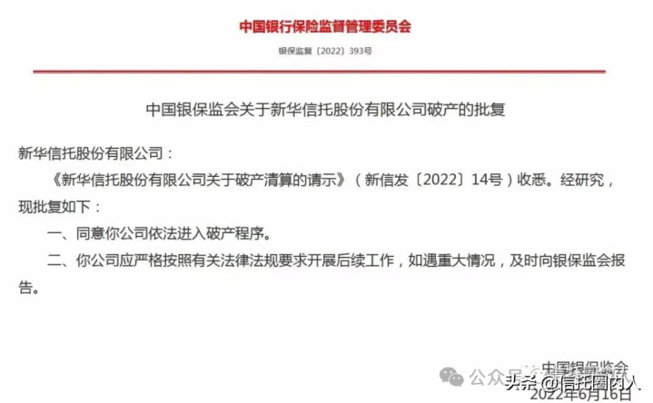 2022年6月,银保监会正式批复,同意新华信托依法进入破产程序,宣告了这家老牌信托公司重生希望的彻底破灭,也拉开了国内持牌信托公司市场化破产的序幕。